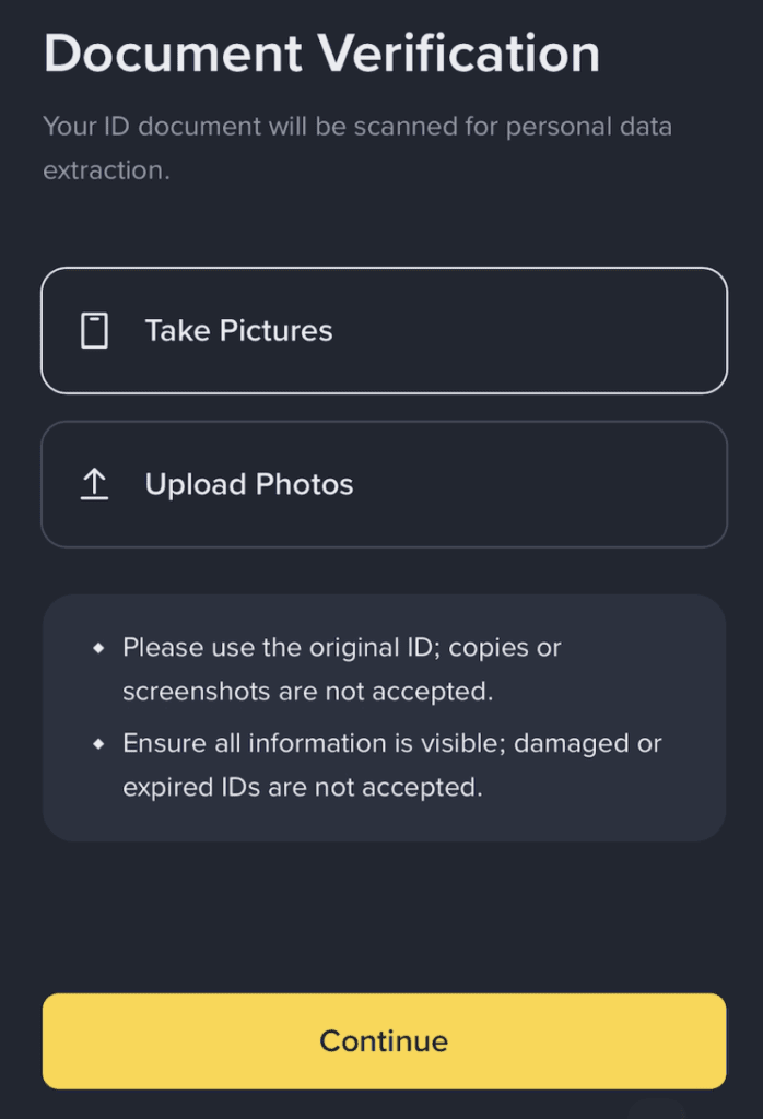 이제 신분증의 사진을 찍어올릴건데, 직접 찍으실거면 Take Pictures를 클릭하시고, 내 모바일에 있는 사진을 올리실 거면 Upload Photos를 클릭한 후 Continue를 클릭합니다.