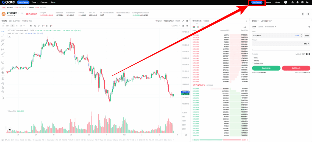 해당 화면은 사이트 URL부터 이미 Testnet.gate~~라고 되어있으며 왼쪽에 보시면 Demo Trading이라고 적혀있습니다.