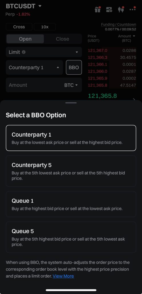 BBO 사용 시, 시스템은 주문 가격을 오더북 내 가장 정밀한 호가 수준에 맞게 자동 조정하고 지정가 주문을 배치합니다.