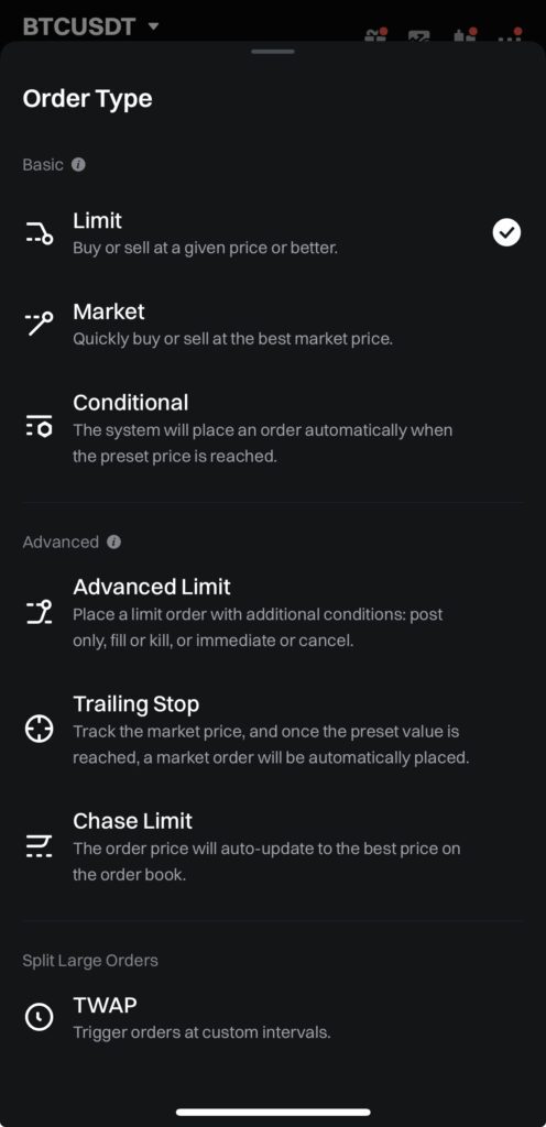 - Chase Limit (추적 지정가): 주문 가격이 오더북의 최적 가격에 맞춰 자동 업데이트됩니다.