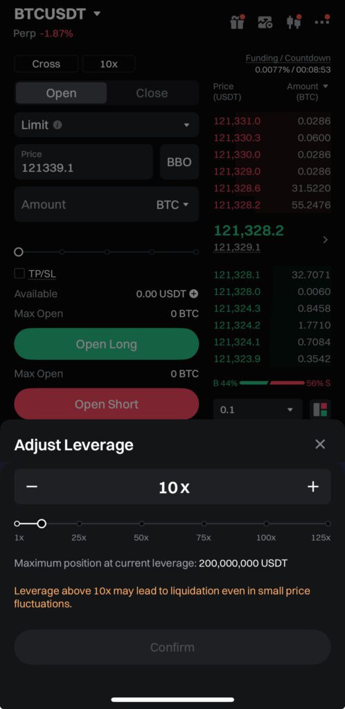 주의 문구: 레버리지가 10배를 초과할 경우, 작은 가격 변동에도 청산이 발생할 수 있습니다.