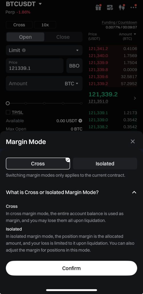 교차 마진 모드에서는 계정 전체 잔액이 증거금으로 사용됩니다. 청산 시 계정의 모든 잔액을 잃을 수도 있습니다. 선물지갑내에 있는 모든 돈을 끌어다가 포지션을 지키는 용도로 사용합니다.