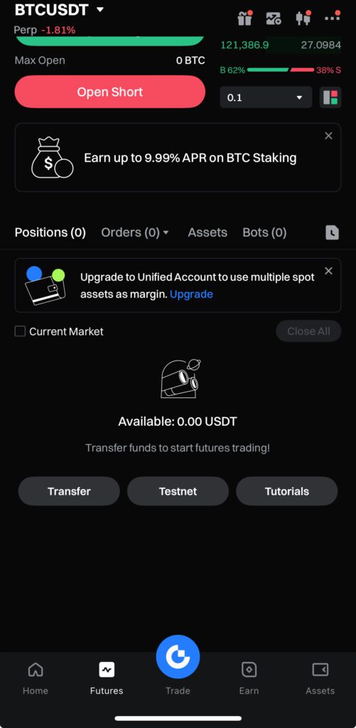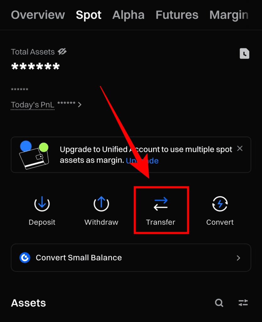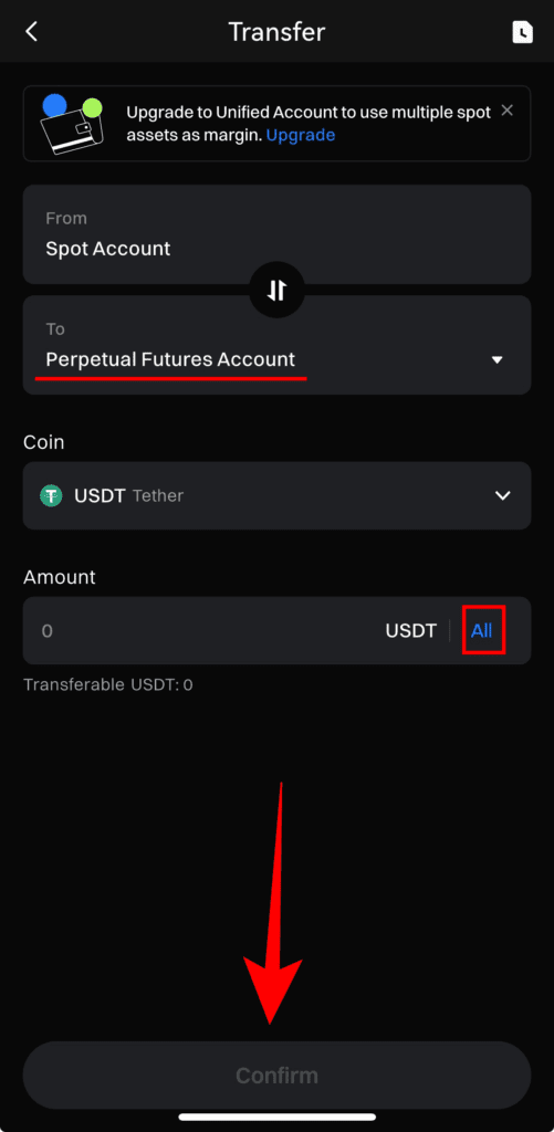 그러면 위 화면처럼 나올텐데요. From에 Spot, To에 Perpetual Futures Account로 해줍니다.
