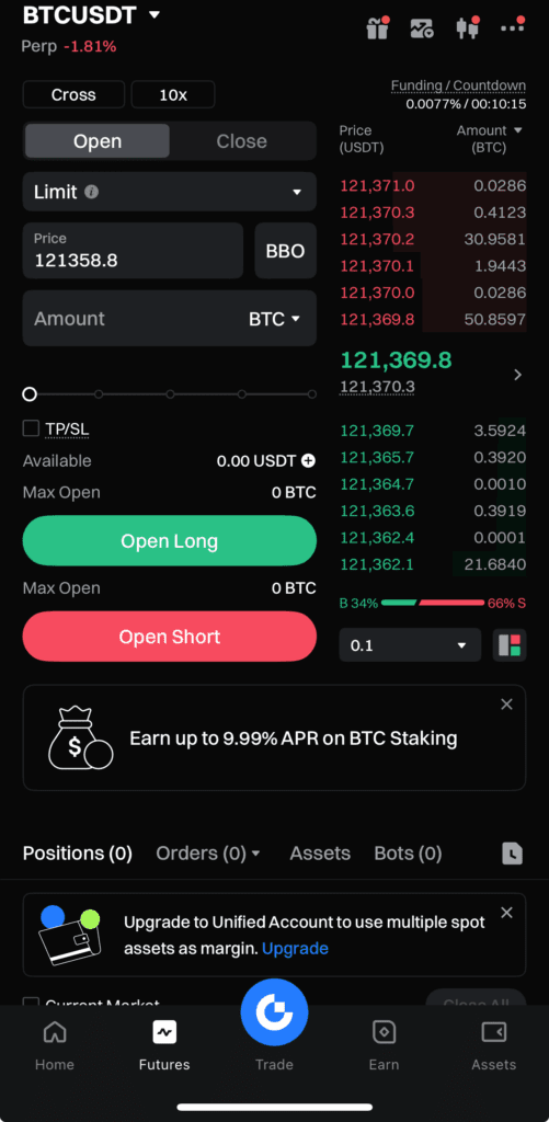 현재의 레버리지는 10배로 설정되어있는데요. 이는 기본 설정입니다. 레버리지 배율에 따라서 수익률이 달라지는데, 보통 50배 100배씩 하는 고배율은 쉽게 청산될 수 있기 때문에 보통 크로스 모드로 사용합니다. 비트코인의 경우 최대 125배까지 가능합니다.