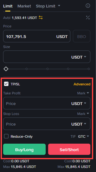 TP또한 시장가로 자동 수익 확정입니다. 사용 방법은 스탑로스와 동일하고 대부분의 거래소에서 같은 방식을 사용합니다.