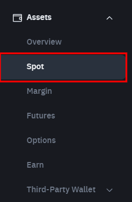 3. 왼쪽에서 Spot으로 이동합니다. 현물지갑에 있는 것만 출금이 가능합니다. 만약 아직 현물 지갑으로 이동하지 않았다면 선물 등의 지갑에서 Transfer 해주셔야합니다.