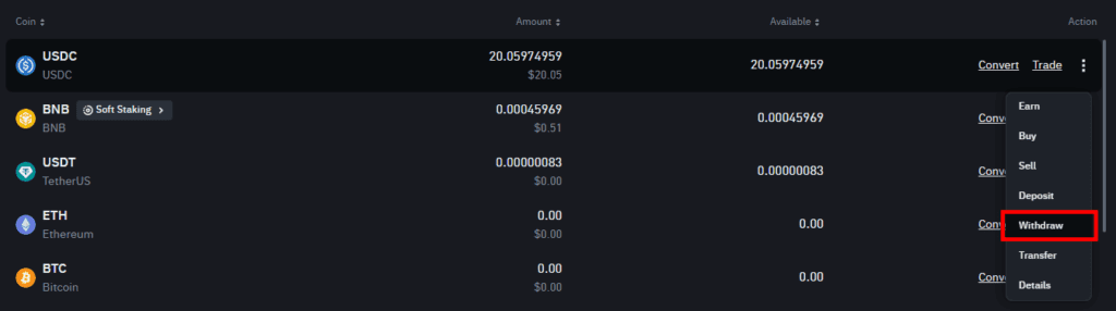 4. 이동할 코인의 오른쪽 …을 클릭해서 Withdraw를 클릭합니다.