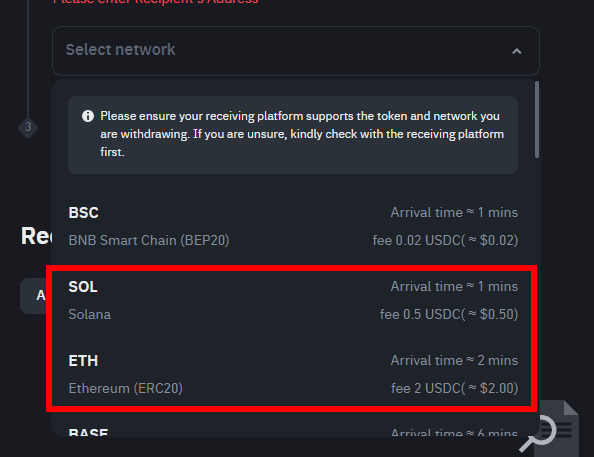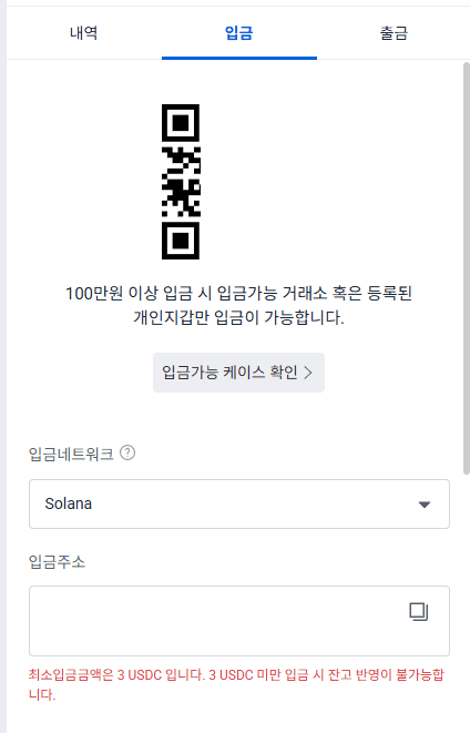 6. USDC는 솔라나 혹은 이더리움 네트워크를 지원하는데, 솔라나 네트워크의 수수료가 더 싸니까 솔라나로 합니다.